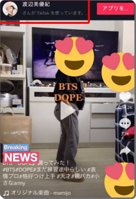 「渡辺美優紀さんがTikTokを使っています。」というログインの表示が出ていたんですね。